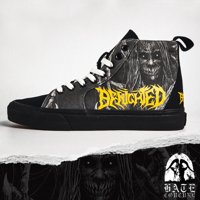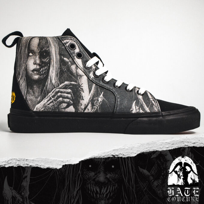 Step into madness with the Hate Couture x BENIGHTED “Ekbom” Sneakers, an unrelenting fusion of brutal fashion and sonic annihilation. Inspired by BENIGHTEDโs grotesquely intense Ekbom album artworkโmasterfully designed by Grindesignโthese limited-edition sneakers embody the chaos, paranoia, and nightmarish descent of Ekbom Syndrome itself. Not for the faint of heart, these kicks are a statement piece for those who walk the fine line between reality and delirium.