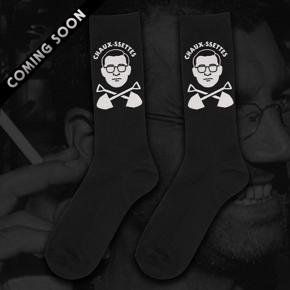 Crafted for those who laugh in the face of taboos, the Chaux-Ssettes pay tribute to the chilling calm and bourgeois charm of a certain elusive Frenchman who vanished into legend. A pair of black socks embroidered with his unmistakable silhouette โ€” glasses, cold stare, and the now-iconic crossed shovels beneath. A design thatโ€™s equal parts provocative, poetic, and morbidly stylish.