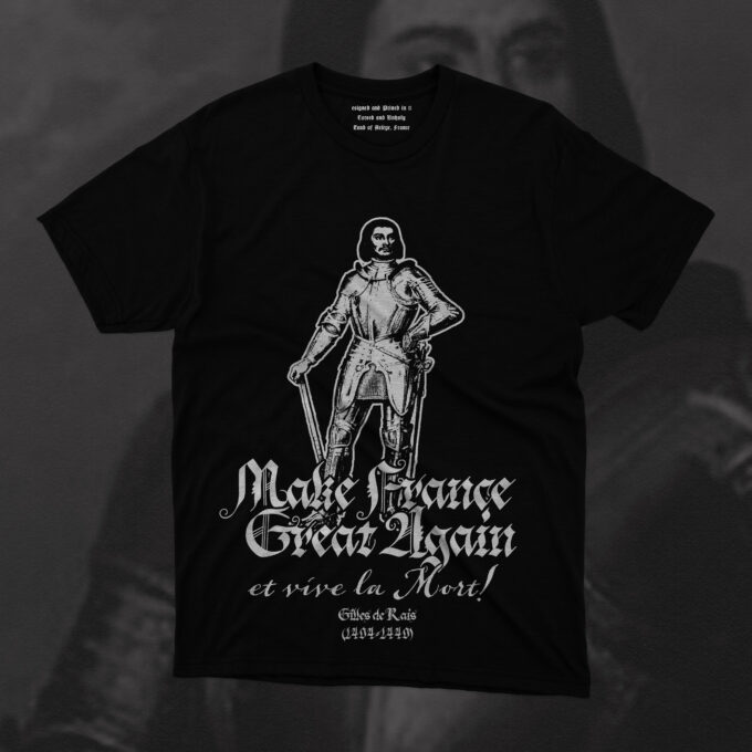 France has long been a land of kings, revolutionaries, and cultural iconsโ€”but beneath its elegant chรขteaux and romanticized history lies a much darker legacy. Hate Coutureโ€™s Make France Great Again T-shirt takes a savage, satirical stab at national pride, reclaiming one of Franceโ€™s most controversial historical figuresโ€”Gilles de Rais, the knight who fought alongside Joan of Arc before becoming one of historyโ€™s first recorded serial killers.