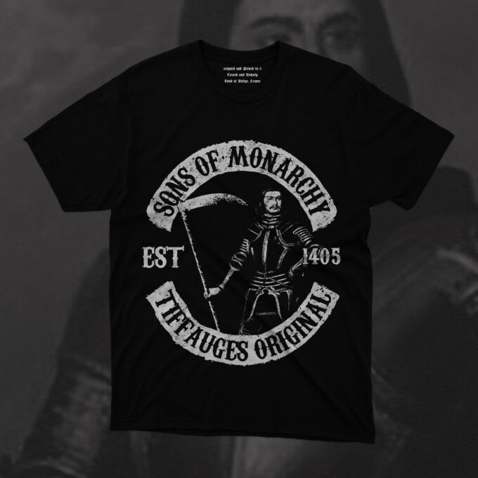 Above him, the phrase “Sons of Monarchy” takes pride of place, a twisted play on the “Sons of Anarchy” aesthetic, but instead of modern outlaws, this design glorifies the sinister rulers of the pastโ€”the monarchs and nobles whose power often came at a terrible cost. The lettering mirrors the bold, iconic styling of medieval banners, reinforcing the connection to Franceโ€™s dark aristocratic history.