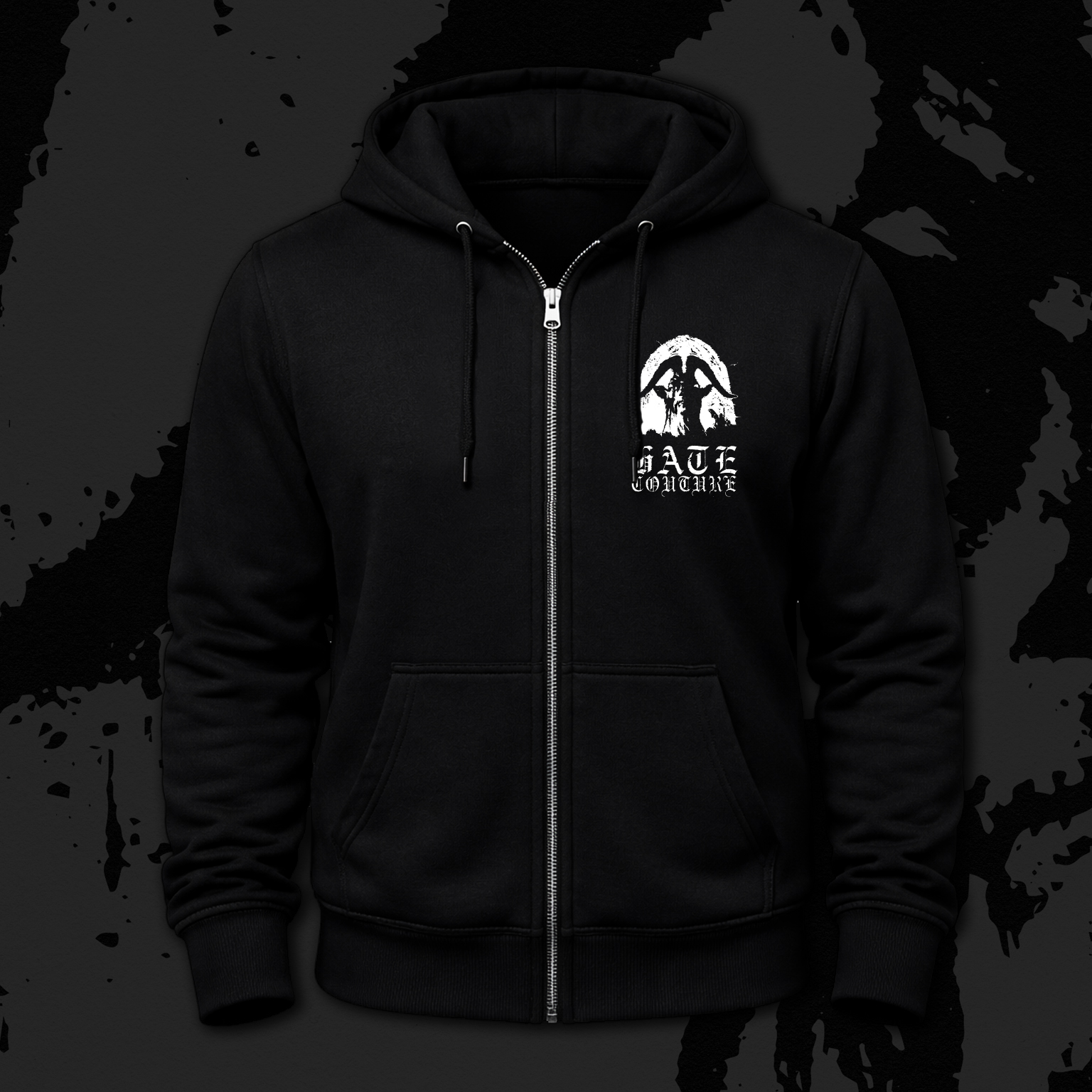 Featuring the iconic Hate Couture sigil of defiance printed over the heart โ because yes, even the godless have one โ and the full back emblem announcing your allegiance to aesthetic damnation, this hoodie is less of a garment and more of a manifesto. It tells the world what you already know: optimism is a scam, and youโd rather look impeccable while descending into oblivion.