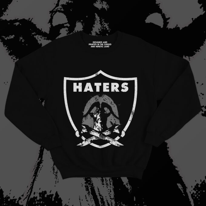 Front and center, the design hijacks the familiar shape of a sports crest but replaces cheerleading spirit with pure contempt. The bold word โHATERSโ sits above a grim, distressed goat-headed figure framed like a blasphemous trophy, flanked by crossed blades that cut through the hypocrisy of mainstream culture. This isnโt a logoโitโs a sigil for the disillusioned, the bitterly honest, the ones who know that authenticity will never trend. Hate Couture doesnโt just twist pop cultureโit drags it through the dirt and nails it to the wall like a warning.