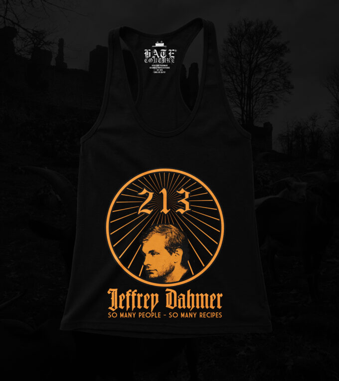 SLAYER song “213”, MACABRE “Dahmer” album and the recent Netflix “Dahmer” serie. The first lines of DANZIG’s “Mother” song could have been spoken by Dahmer so this shirt is a mandatory buy!