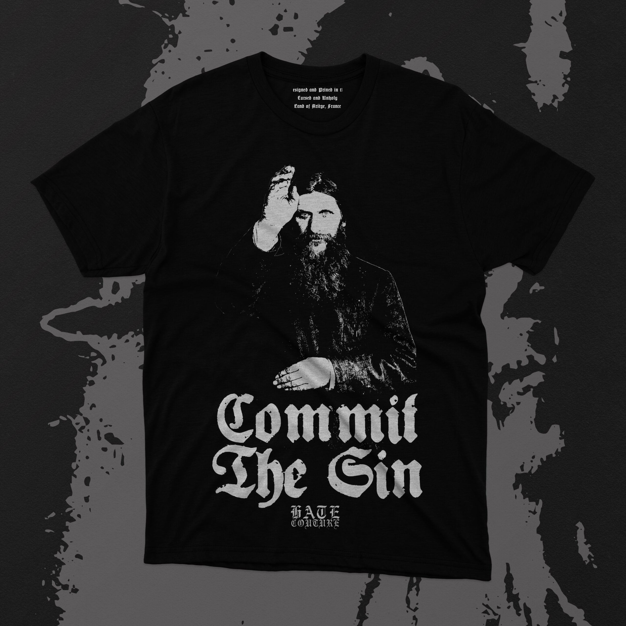 This โCommit The Sinโ t-shirt from Hate Couture doesnโt whisper rebellion โ it smirks at it, lights a cigarette with it, and tells it to try harder. Front and center, Rasputin himself โ historyโs most persistent โproblem that refused to dieโ โ raises his hand somewhere between blessing and bad decision. A holy man, a fraud, a survivor of poison, bullets, and common senseโฆ basically the patron saint of doing exactly what you shouldnโt.