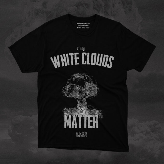 The Hate Couture T-shirt takes a bold and controversial stance with its design โWhite Clouds Matterโ, a darkly ironic parody of the โBlack Lives Matterโ slogan. The graphic features a nuclear explosion with a massive nuclear mushroom cloud, symbolizing the sheer destructive power and ominous nature of this statement. Itโs a stark commentary on destruction, power, and the absurdity of certain cultural parallelsโblending shocking visuals with biting satire.