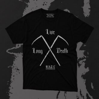 Printed on premium black cotton, this bold, controversial piece is for those who revel in the macabre, the morbidly satirical, and the boundary-pushing ethos of HATE COUTURE.